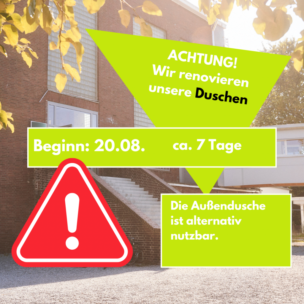Achtung! Ab dem 20.08. sind unsere Duschen für ca. 7 Tage nicht nutzbar. Wir renovieren für euch! Alternativ könnt ihr die Außendusche im Sauna-Außenbereich nutzen. Neben den Damenduschen müssen wir leider auch nochmal die Männderduschen nachbessern.